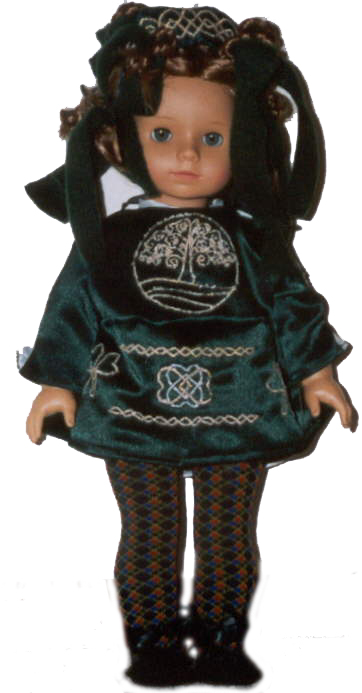The shoes were made of felt and ribbon. Unfortunately, they don't show up in the photos and are a bit difficult to explain. I made soft shoes. If you look on sites about step dancing, you can check out the types of shoes they wear. It's possible you will find some doll shoes that look close enough.