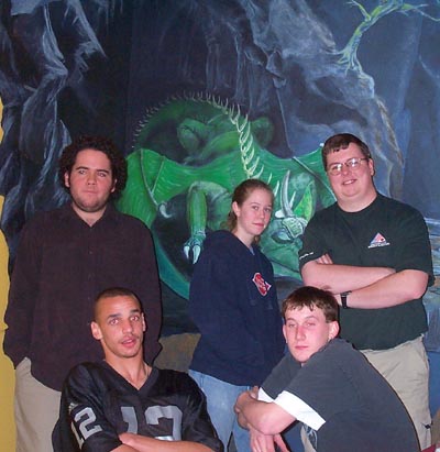 We decided to answer the age old question "How many Questers can we fit into a Honda Civic?" And the answer is......Seven. To give you an idea, you can see Heckler's left shoulder vaguely, and his girlfriend is sitting on his lap. DepCartman is driving, and in the picture you can see part of KungFu's face, Kermit and Lord B in the back seat...and that's BlueFlame's head popping out from the trunk....need we say more?