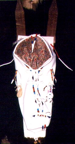 This is an example of one of my cradleboards. The particular cradleboard shown here is Cheyenne, partially beaded on white braintan leather, with hawk bells, glass pony beads, and lizard fetish bag.