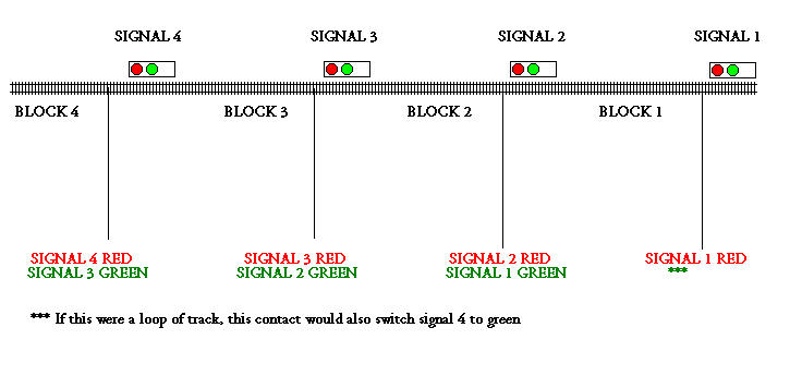 For each block signal, there must be one contact switch. These can be switching tracks or reed switches, even infrared light beams and mechanical switches. The diagram shows how these need to be hooked up, i.e. what function they need to perform on the signals.