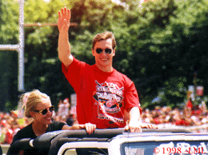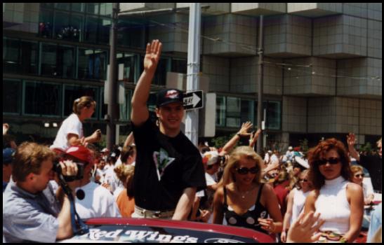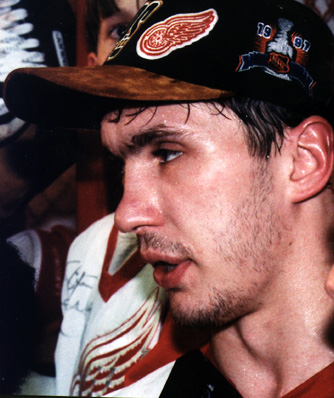 Left Wing Slava Kozlov joined the Wings in 1990, and became a valuable player for Detroit. A finesse player with speed and strength, Slava has brought much talent to the team. Born in Russia, Slava also played for the soviet central Red Army team, but a little later than his Russian teamates. He is a talented hockey player, and he is also single, even though he always has the most beautiful girls in his car at the Stanley Cup parades....maybe they are just friends.....