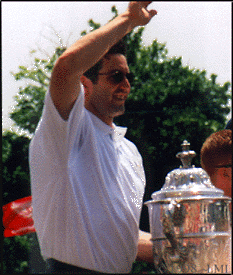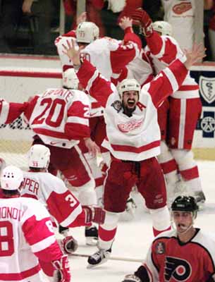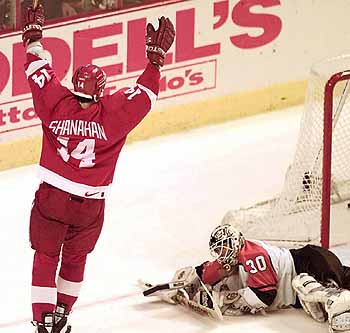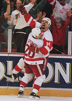 Whoa! Brendan! Not only is he very good-looking, but also very talented. Traded to Detroit on Oct.9th, 1996 from the Hartford Whalers, Brendan Shanahan got here just in time for the home opener."I went out to the rink and put my sweater on, I got there about 10min actually before warm-ups started...." Said Brendan. And Detroit was very lucky to get him. He became a key player during the regular season and the playoffs. He is as Intelligent off the ice as on, he is a very well-read man who often quotes Shakespeare in the lockeroom. His talents are well appreciated here in Detroit, and this is where Brendan belongs. "I was extremely excited to be a part of that (the Redwings) because I knew growing up what a history that town has for hockey"said Brendan about his first game as a Redwing.
