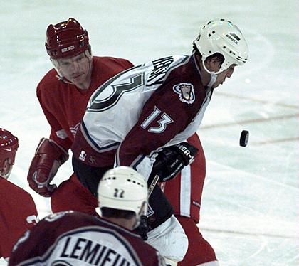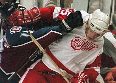 Defenseman Aaron Ward went to college at the University of Michigan(yay!) where he played hockey. He was then drafted to Winnipeg, but then traded again to Detroit. He played at Adriondack untill the 96-97 season, where he came up big, especially in the playoffs. Once a fan pointed out to him that there was a u.s. navy ship named the S.S.Aaron Ward (by coincidence) and sent Aaron a picture of it. Ever since, Aaron has kept that picture in his locker. Aaron is also a big, good, fighter for his team.
