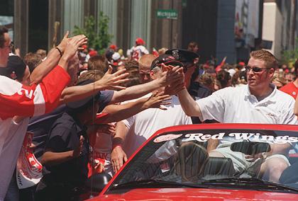 Kevin Hodson, Detroit's now-second goalie and resident prankster finally got his chance to play more than 10 games last season since Vernon was traded to San Jose last summer. Kevin, who spoke about his season tickets at the JLA during the ticket holder rally after the cup was won in '97, was apparently the first of the wings to adopt 'raise the roof'. During the 'soccer' games the boys play in the lockeroom, Kevin would raise the roof when he scored a goal. Eventually the team adopted the gesture, and it was official when Stevie performed it after handing the stanley cup off to his teamates after sweeping Philidelphia in '97. By the time the parade arrived on tues, the whole city of Detroit had embraced the 'raise the roof' gesture. It is sure to be the symbol for raising the cup in the future years of Detroit hockey.