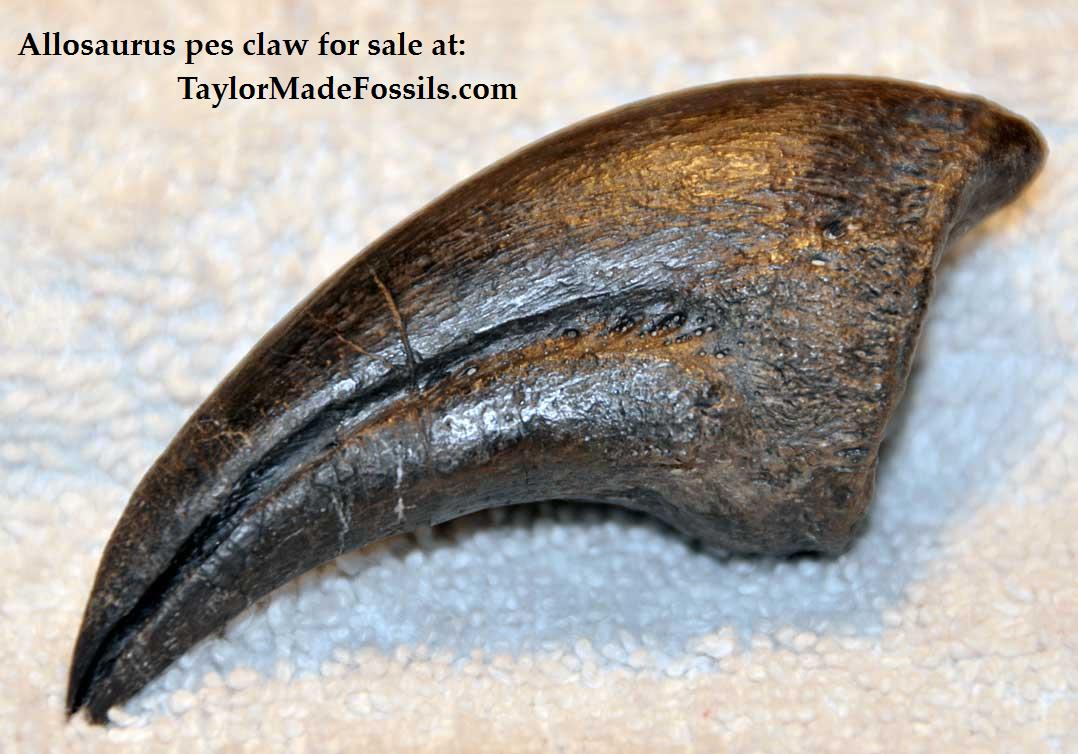 | Torvosaurus Tooth 4.25" Size: 4-1/4 inches in length Description: Rarer and more scientifically valuable than than a T'Rex tooth! You are looking at an exceptionally beautiful and high-quality Therapod tooth from the huge, Jurassic-age, meat-eating dinosaur, Torvosaurus. It has great glossy enamel and serrations on the crown, and a partial root is attached. Shipping and handling (including insurance) and applicable sales tax determined at time of purchase. The tooth is virtually perfect with no restoration. We cleaned and stabilized it, and it is ready to join your collection! It comes with a certificate of authenticity, and was found this summer on private ranch land in Wyoming. Larger images available. $4,200 (plus shipping)