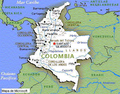 Colombia se encuentra en el extremo noroccidental de Sudamérica y comparte fronteras con Panamá, Venezuela, Brasil, Perú y Ecuador. Tiene una extensión de 1.141.748 kilómetros cuadrados y es el cuarto país más grande de América del Sur después de Brasil, Argentina y Perú. Tiene 2.900 kilómetros de costa, de los cuales 1.600 lindan con el Mar Caribe y 1.300 con el Océano Pacífico. Además del territorio continental, Colombia tiene varias islas, entre las cuales se destacan el archipiélago de San Andrés y Providencia en el Mar Caribe y Gorgona, Gorgonilla y Malpelo en el Pacífico. Viven en el país 35.800.000 habitantes. Su privilegiada posición geográfica lo convierte en la entrada a Sudamérica y en el único país suramericano con costas sobre los dos océanos. |