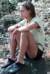 The Maraamu decide to go on a hike, and Kathy leads the way. Then gets them lost. But fear not, as Kathy has that remarkable talent for finding food. They stumble on a bubbling stream, teeming with large shrimp. Everybody starts catching shrimp, everybody except Sarah. Catching food just sounds too much like work to her, and as we all know, she didn't come to the island to do any work. So she sits for a bit, scratching all her No-No bites, until her attention span is depleted. She announces that she's going back to the camp to hack off her legs. The others barely notice her leaving. Sarah was barely 50 to 75 feet away when she got lost. This girl is just too stupid! I now speculate that she had somebody fill out the application to get on the show for her. As Sarah returns to the stream, following Gina's voice, she remarks, "I guess I'm not going anywhere." OH, HOW WRONG YOU ARE, SUNSHINE!!!