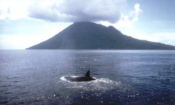 Above: The Volcanic Island of Manado Tua, Orca in foreground