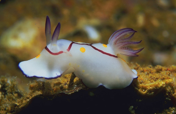 Photographed in the Arabian Gulf, note that the purple rings around the gills and rhinophores are joined by a purple line.