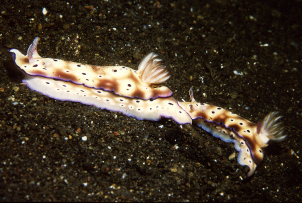 Our second dive was in a thunderstorm with the tide coming in, viz was appalling (<1M), however once down at 10M it was as good as the previous dive. Fortunately it was easy to spot nudibranchs on the black volcanic sand, especially the pair of Risbecia tryoni below.