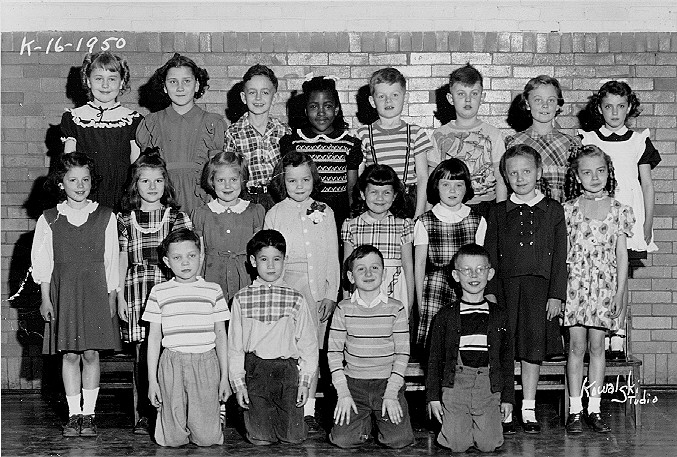 The Kowalski Studios coding system confirms what I had already concluded, that this is Mrs. Isaacson's second grade class in the Spring semester of 1950. The photo was made in the gymnasium of Kalamazoo Street School, where the Board of Education's attractive meeting room is now located. As I recall, there was an awkward number of my cohorts registered at Kalamazoo Street, and in the second semester of first grade, Mrs. Isaacson had a class that was half first graders (including me) and half second graders. I know it irritated her that I was following the second grade lesson instead of my own and writing script before I was supposed to. By second grade it looks like we had become an abnormally small class of 20, with undoubtedly another class of second graders with another teacher. I know that many of my later classmates are missing from this photo and probably in the other class, including Ron Porter (Jack Davis may have been at Lincoln then as I think he appeared as a classmate only in 5th and 6th grades). The author is the boy in glasses kneeling at right in the first row. I believe the boy next to me is Morey Fineout (sp.?), who had been my neighbor when we lived at 505 Cherry (we had only moved away a few months before this picture was taken), and the boy next to him, in the shirt with plaid facing a cuffs, is Jimmy Gold. Vicky Brown is the black girl in the top row, and I believe the boy in the plaid shirt next to her is Tom Van Epps (sp?). Other identifications are a struggle, and if I err I ask forgiveness. I believe the girl in the print dress with the separate choker and the curls is Helen Huizinga (sp?), whom I remember with very red, curly hair. I believe the girl in the dark dress with white collar above Jimmy Gold's right shoulder is Collette Simpson. Other names escape me. Vicky's status as the only black person in the picture is misleading as the entire 2nd Grade cohort at Kalamazoo Street included several other African Americans including Thaddeus Cromwell and Esther Parker who immediately spring to mind.