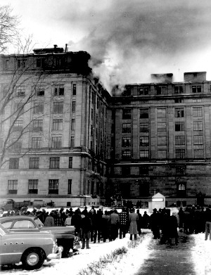 In what appears to be the first hour of the fire, sheets of orange flame lick from the M floor windows at the location of the Highway Department microfilm room and from the roof and head-buildings above. This scene was clearly visible from the classroom windows of Kalamazoo Street School and soon all normal activity was suspended and we were led outside to witness this astonishing sight. The term "fireproof building" never meant anything to any of us afterward who saw this happen. Photo from State Archives of Michigan, negative 18078, folder "Disasters, Fire, State Office Building".