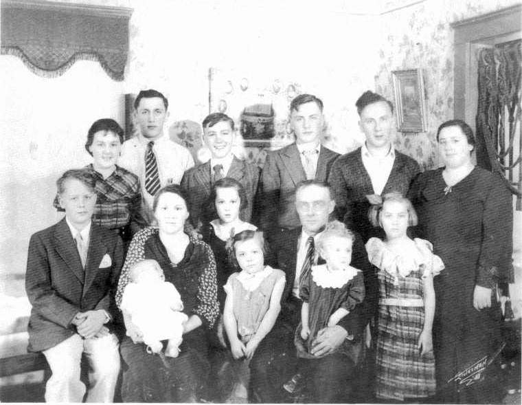 Virgil, Mother Susie, in Susie's lap is Willard, above and to right of Susie is Norma, below Norma is Betty, Father Earl, Emogene (Earl's lap) and Katherine