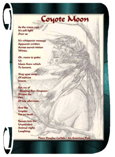 The Great Spirit Gave us this country as a home. You had yours. We did not interfere with you. The Great Spirit gave us plenty of land to live on, and buffalo, deer, antelope and other game. But you have come here; you are taking my land from me; you are killing off our game, so it is hard for us to live. Now, you tell us to work for a living, but the Great Spirit did not make us to work, but to live by hunting. You white men can work if you want to. We do not interfere with you, and again you say why do you not become civilized? We do not want your civilization!!!! We would live as our fathers did, and their fathers before them. Crazy Horse "I will follow the white man's trail. I will make him my friend, but I will not bend my back to his burdens. I will be cunning as a coyote. I will ask him to help me understand his ways, then I will prepare the way for my children, and their children. The Great Spirit has shown me - a day will come when they will outrun the white man in his own shoes." "In early days we were close to nature. We judged time, weather conditions, and many things by the elements--the good earth, the blue sky, the flying of geese, and the changing winds. We looked to these for guidance and answers. Our prayers and thanksgiving were said to the four winds- -to the East, from whence the new day was born; to the South, which sent the warm breeze which gave a feeling of comfort; to the West, which ended the day and brought rest; and to the North, the Mother of winter whose sharp air awakened a time of preparation for the long days ahead. We lived by God's hand through nature and evaluated the changing winds to tell us or warn us of what was ahead. Today we are again evaluating the changing winds. May we be strong in spirit and equal to our Fathers of another day in reading the signs accurately and interpreting them wisely. May Wah-Kon-Tah, the Great Spirit, look down upon us, guide us, and inspire us, and give us courage and wisdom. Above all, may He look down upon us and be pleased." Chief Seattle "When the Earth is sick, the animals will begin to disappear, when that happens, The Warriors of the Rainbow will come to save them." Chief Joseph Nez Perces' "If the white man wants to live in peace with the Indian, he can live in peace..... Treat all men alike. Give them all the same law. Give them all an even chance to live and grow. All men were made by the same Great Spirit Chief. They are all brothers. The Earth is the mother of all people, and all people should have equal rights upon it....... Let me be a free man, free to travel, free to stop, free to work, free to trade....where I choose my own teachers, free to follow the religion of my fathers, free to think and talk and act for myself, and I will obey every law, or submit to the penalty. Qwatsinas (Hereditary Chief Edward Moody), Nuxalk Nation O' GREAT SPIRIT Whose voice I hear in the winds, And whose breath gives life to all the world, hear me! I am small and weak, I need your strength and wisdom. Let me walk in beauty, and make my eyes ever behold the red and purple sunset. Make my hands respect the things you have made and my ears sharp to hear your voice. Make me wise so that I may understand the things you have taught my people. Let me learn the lessons you have hidden in every leaf and rock. I seek strength, not to be greater than my brother, but to fight my greatest enemy--myself. Make me always ready to come to you with clean hands and straight eyes. So when life fades, as the fading sunset, my spirit may come to you without shame If all the beasts were gone, man would die from a great loneliness of the spirit. For whatever happens to the beasts soon happens to man. Chief Seattle They took the whole Cherokee nation Put us on this reservation Took away our ways of life The tomahawk and the bow and knife Took away our native tongue And taught their English to our young And all the beads we made by hand Are nowadays made in Japan Cherokee people, Cherokee tribe So proud to live, so proud to die They took the whole Indian nation Locked us on this reservation Though I wear a shirt and tie I'm still part redman deep inside Cherokee people, Cherokee tribe So proud to live, so proud to die But maybe someday when they learn Cherokee nation will return Will return Will return Will return Will return The award below was given to me on Sept 08,1999 Thank you Sue!!! I am honored to place this on my page Click on the award and you will be taken to her site You will be spellbound by her writting NGcracker Friends Page Butterfly Kisses My Gifts/Awards 11th Commandment Snow Globe Tutorial Story Of A WOLF For The Love Of My Daughter HALF BREED BITCH For The Love Of Wolves Thank you for visiting my page at Angelfire. Please come back and visit again! Email: rwladywolf@aol.com