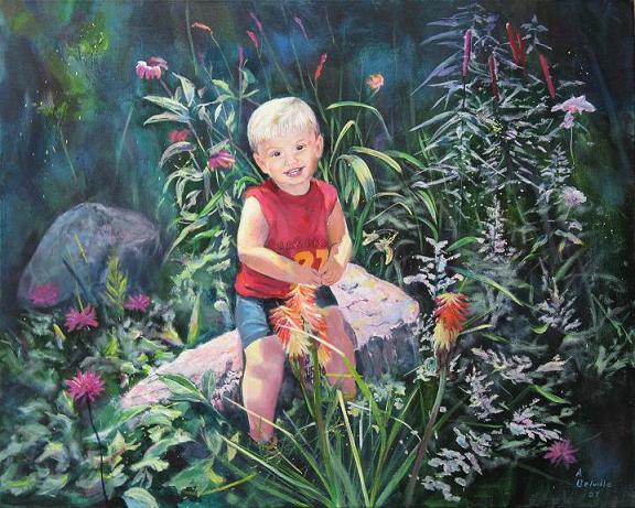 Artist sketches and paints portraits, and landscapes. Alan can paint from your photos, and can include a lost loved one in your family portrait. The artist can render a work of your pet, home or favorite view of nature. Above is a 24" x 30" Acrylic painting on canvas.