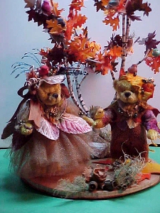 | Meet Lysa & Lloyd Ever-Forest!!! This lovely couple are forest Brownies (elves) who take care of the Fall season--they change the color of the leaves, help the old ones fall to the ground; they also collect all the old dropped accorn nuts and use the shells for nests for all their bird friends of the forest. Lysa & Lloyd stand 3 1/2" tall and are dress in their forest best. Lysa in her best gold spun spider-silk petticoa and autumn leaf waistcoat topped off with a Fall hat. Lloyd has on his best wool nubby pants and leaf vest, his topcoat, and his favorite cap. $175.00 for the vingette!!!!----SOLD!!!!! |