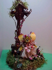 | Introducing --Summer Sprite!!! Summer tends to summer flowers and watches the baby birds and new blades of grass. She is dressed in her summer garden dress of antique lace petticoat and pastel leaf waistcoat. She likes to accent her dress with summer roses as well as wearing them in her hair. She likes a rose that will show off the color of her gold wings which are tipped with bright pink(she has a little vanity, but otherwise she is very sweet--- Summer is never Shy!)...........$125.00 for the vingette --SORRY SOLD!!!!! |
