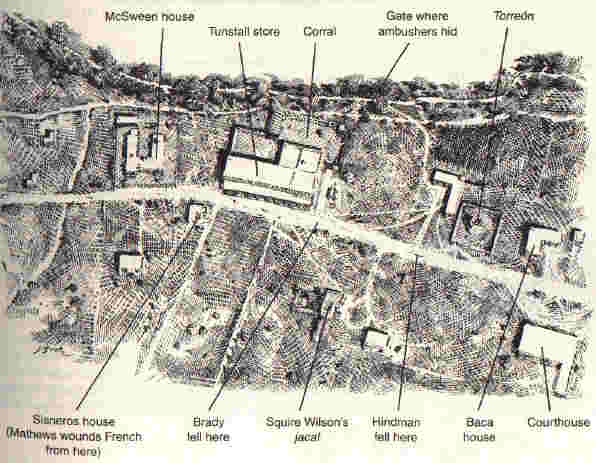 Brady and his men pass in front of the Tunstall store. The Regulators hold their breaths, cock their rifles, take aim. BANG!! At least six rifles erupt as one, pause, and then keep erupting at will. Sheriff Brady falls to his knees, takes a gasp, then falls face first into the muddy ground, dead. His body is perforated with at least nine bullet holes. Deputy George Hindman (himself a member of the posse that killed Tunstall) takes a bullet in the neck, most likely fired from the rifle of Frank MacNab, and plunges into the ground as well. He tries to crawl away, yelling for water. Ike Stockton, a local saloon keeper, races to the street with a hat full of water, but before he can assist Hindman, another shot, this one probably fired by Fred Waite, hits Hindman, killing him. The other three deputies, Peppin, Mathews, and Long, panick and scatter. As they flee, Long is also hit, but manages to stay afoot and takes cover in the nearby torreon. Peppin and Mathews, the latter of which is being shot at by Billy Bonney, race to the Cisneros house, located across the street from the Tunstall store. As the Regulators continue to fire at them, a random bullet manages to hit good ol' Squire Wilson, a Tunstall-McSween partisan and the local Justice of the Peace, in the buttock. He falls to the ground, but is not seriously injured. As for Mathews and Peppin, they manage to make it inside the Cisneros house, both untouched by the Regulators' bullets.