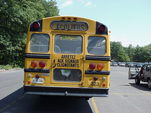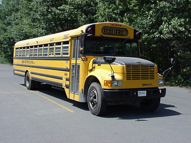 Year: 1990's Model: Thomas International Conventional ID#: 323 Owner/Operator: ? Notes: In place of SCHOOL BUS there is the French word for school bus, ECOLIERS. Also in place of STOP on the stop arm is ARRET. Also note the bilingual labels on the emergency exits. If you've read the SBF forums, you'll know I agree with this greatly. Location: Quebec, Canada Photo By: David Harkness |