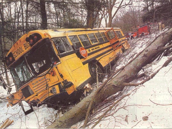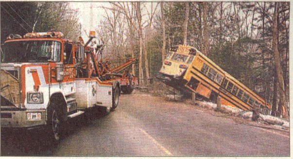 Year: 1998 Model: Blue Bird TC/2000 RE ID#: 36 Owner/Operator: Laidlaw Transit School System: New Milford Schools Location: New Milford, CT Notes: The driver was heading to her morning run with two kids already on the bus. When she hit the black ice, the bus took out 25 guard rail posts before turning down the hill to be stopped by two trees. No one was injured. It took two hours for the two tow trucks to pull it out. Photos Courtesy of: The New Milford Spectrum Submitted by: David Harkness |