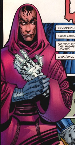 Catastrophic Irrational Attraction to inflicting pain. When Desaad makes his Reason feat roll for building an item, the tech level is shifted one column to the right as he always designs an item or weapon in a way that will cause the most pain.