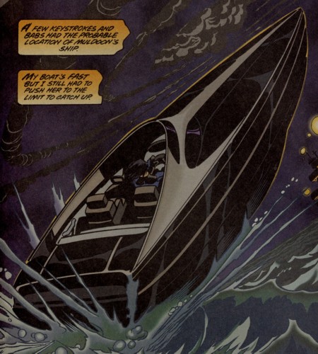 One of the first vehicles in Nightwing's current arsenal and currently resides at the Bludhaven pier. Not much is currently known about the vehicle, other that it's top speed of 50 knots (approx. 58 mph), and its outward appearance.