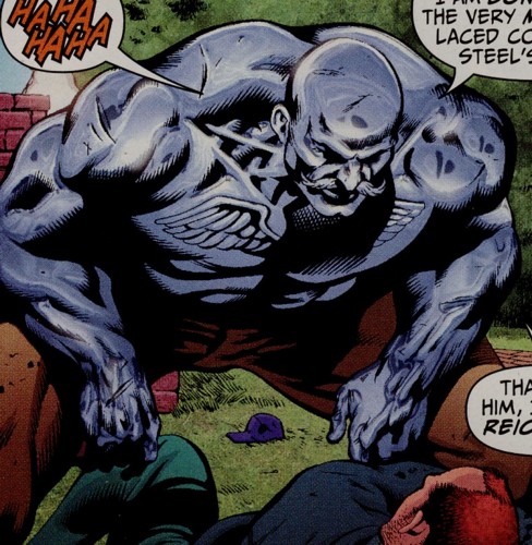 -Metallic Touch: Reichsmark transforms people or objects to a metallic statue with a Fighting FEAT roll. Against people, this power works through clothes but touching someone in a battlesuit affects only the suit, not the wearer. Objects become Mn material and Reichsmark often uses them as Blunt weapons. If two people were holding hands and Reichsmark touched one of them, both would be affected. With really big objects, a volume of 10 cubic yards can be transformed with a single touch.