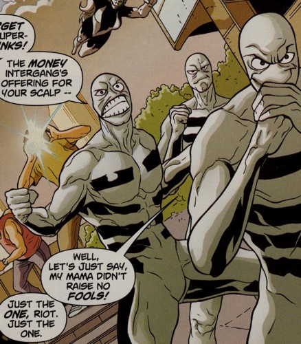 Duplication: Riot can create exact duplicates of himself. He has mastered his ability to such extend that he can now create dupes at will as well. He can create up to 40 dupes. The dupes are totally independend but usually work well together. Riot may absorb his dupes back to himself.