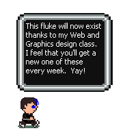 1/23/03 I can't find a way to convert all of my .bmp's to .gif's, and it is starting to bug me. Just the 3 strips are taking up almost 50% of the site's memory. So, unless I figure out a away to get that task done in the next 3 weeks, you now have 3 weeks worth of fluke strips! Also, if anyone knows how to convert a .bmp file into a .gif file, please send me an e-mail at the adress at the bottom of the page. It would really, really help. Thanks, everyone! ~Ness 12![]()