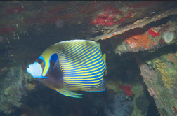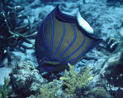 This angelfish is very common in the Red Sea and the Arabian Gulf, the adults can grow to about 50cm and some individuals I have encountered can be extremely friendly (when diving without camera!). The photo on the left is an intermediate stage between juvenile and adult, the one on the right is a fully grown adult.