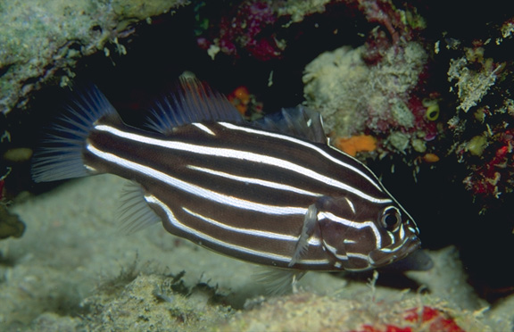 Grammistes sexlineatus photographed at Blue Beach, North Obhur Jeddah. Do not keep these in aquariums as they produce a poison that will kill other fish