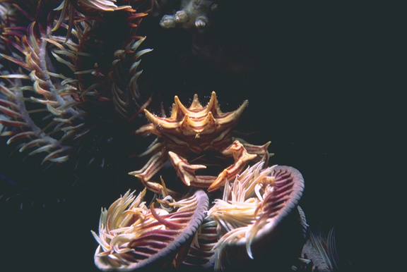 These crabs Ceratocarcinus cf. spinosus can be frequently found living a symbiotic relationship with a host feather star