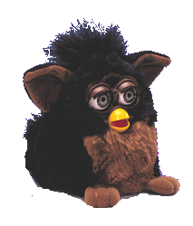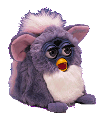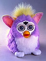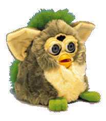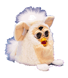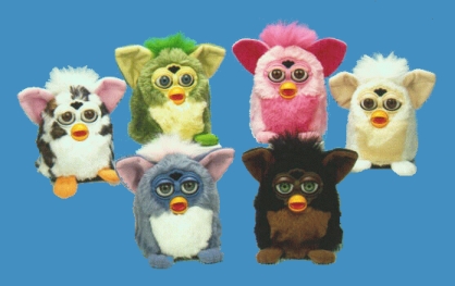 (From left to right: Snow Leopard Furby, Frog Furby, Flamingo Furby, Lamb Furby, Elephant Furby, Gorilla Furby.)