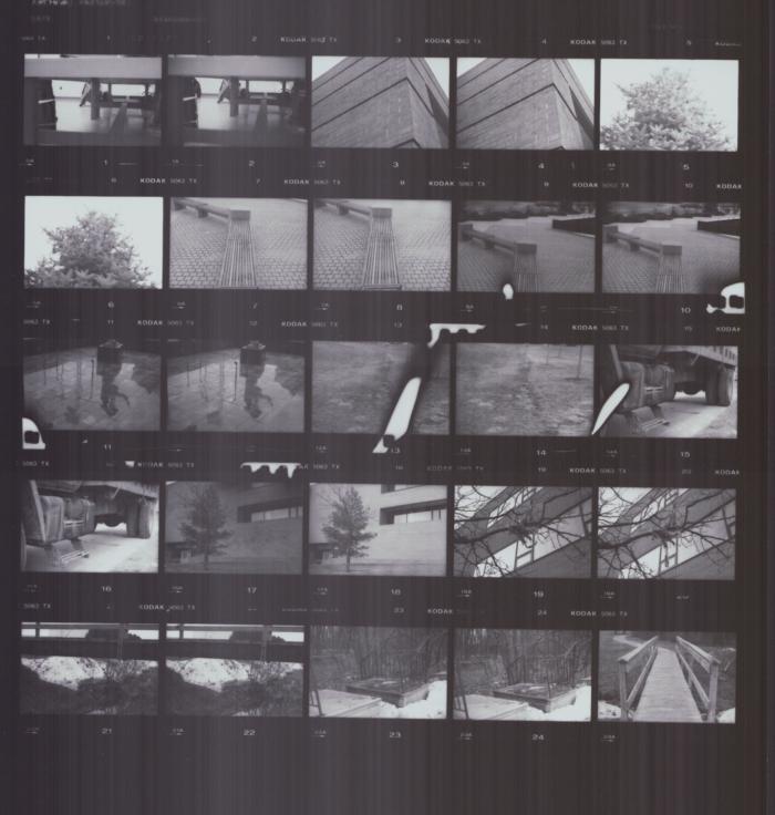 This is the second roll I shot; the assignment was to find a subject and shoot it from an unusual vantage point (up high or down low, for example) and with both a deep and shallow depth of field. I didn't understand the assignment completely for this roll, so Rolls 3 and 5 have better examples of unusual vantage point and the two depths of field. I used the very last picture on the roll (the bridge) for my portfolio for the deep depth of field even though the vantage point wasn't very unusual! Also as part of my portfolio, I used the empty fountain (frame 12) with a swan from Roll 3 burned into it and a solarization of the caution tape (frame 19) - which I'll explain later.