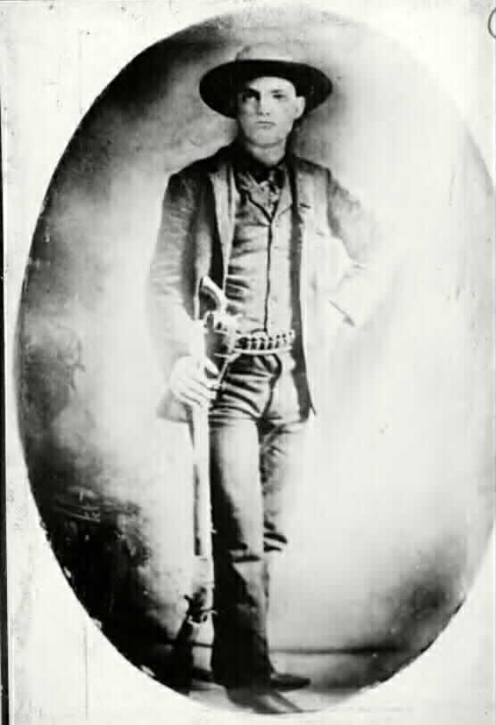 This photo of Jesse is believed to have been taken at Hot Springs, Arkansas in 1874. He was either twenty-six or twenty-seven at the time. The pistol, rifle, and outfit were probably studio props. Note how similar this photo is to the famous tintype of fellow outlaw Billy the Kid.