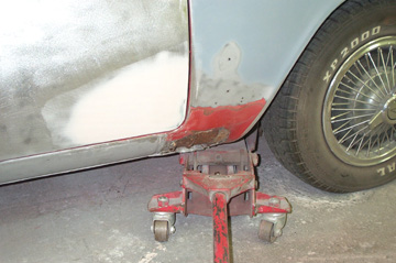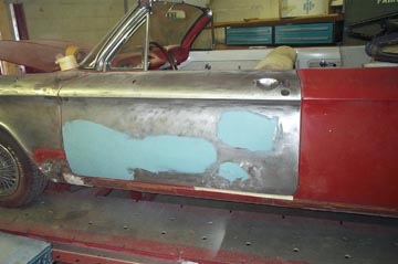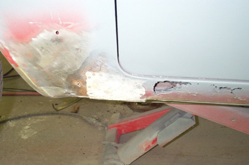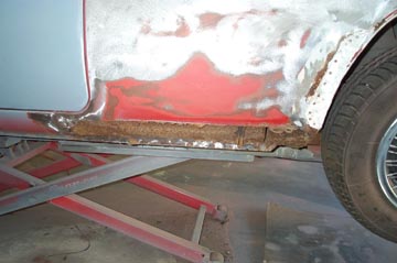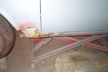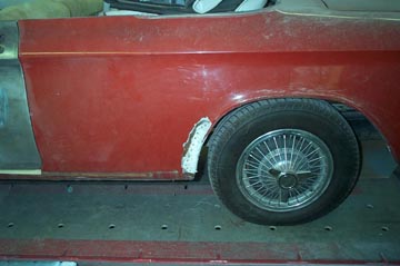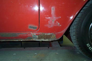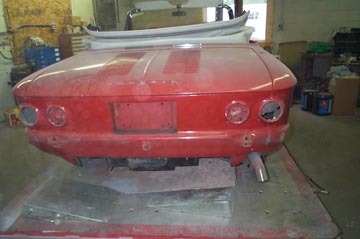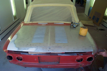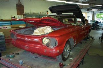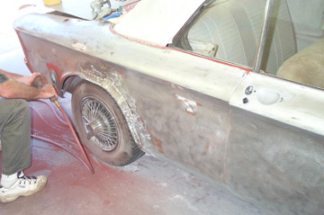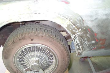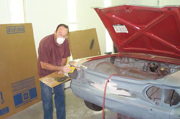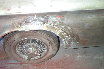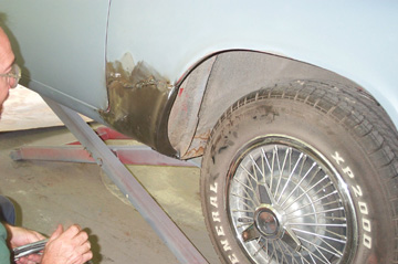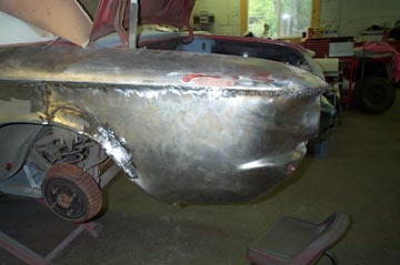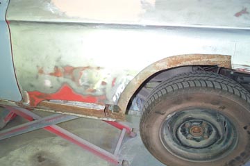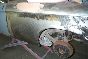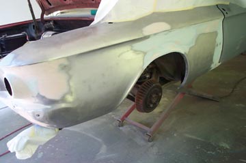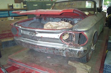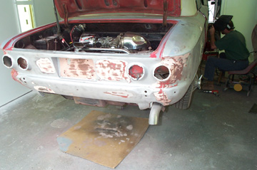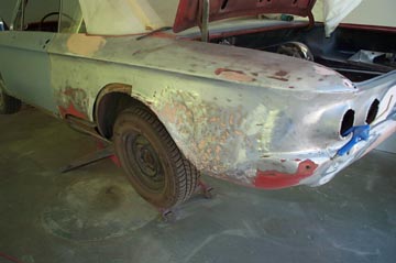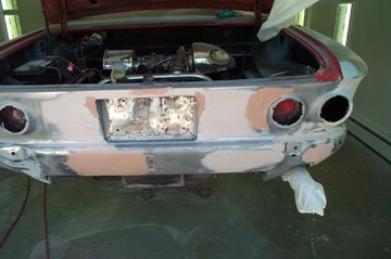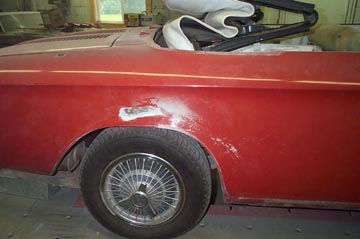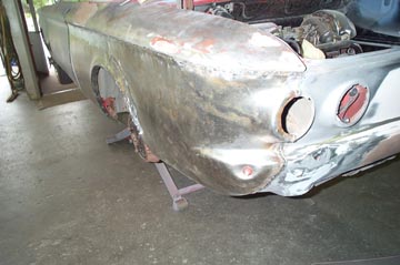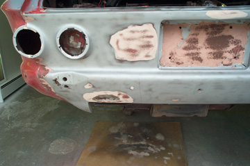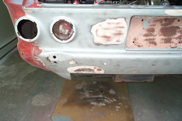 These pictures represent 8 hours of work. This included removing all the exterior trim, bumpers, door handles, headlights, taillights, etc. The more trim and paint that were removed the worse the body looked. As you can see there has been a ton of work done on this car before and a ton to be done on it now. It appears that every panel has been worked on or replaced before. So far it will be necessary to replace both front fenders at the rear, left rocker panel, both quarters at the front back to over the wheel wells, and the gutters in the engine compartment as well as the trunk. Also the trunk bottom, and battery box needs to be replaced. There is also rust thru in the engine compartment at the front on both sides. I haven't looked at the floor yet but it seems to be solid.
