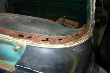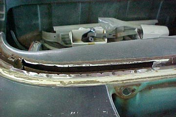 Picture on the left shows the passenger side windshield opening at the bottom under the garnish molding. Picture on right shows the same area after the bad area has been cut out and is ready for patch.