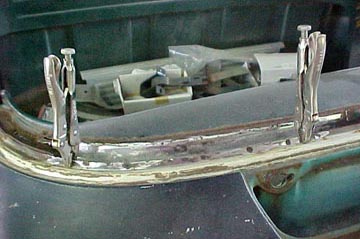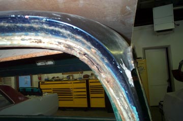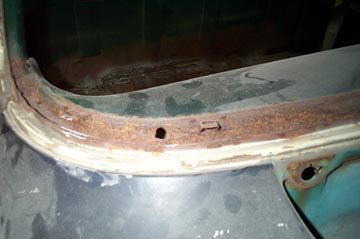 Picture on left shows the driver side windshield opening at the bottom under the garnish molding. This is the same area after a home made patch has been welded in.