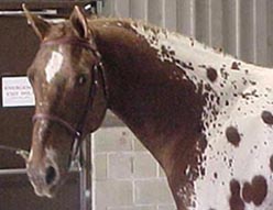 Never Say Never (OMA's Highland Flung x Fairest Of the Fair) 1988 red bay blanket appy stallion. Bred by October Moon Acres. FFC: 1991