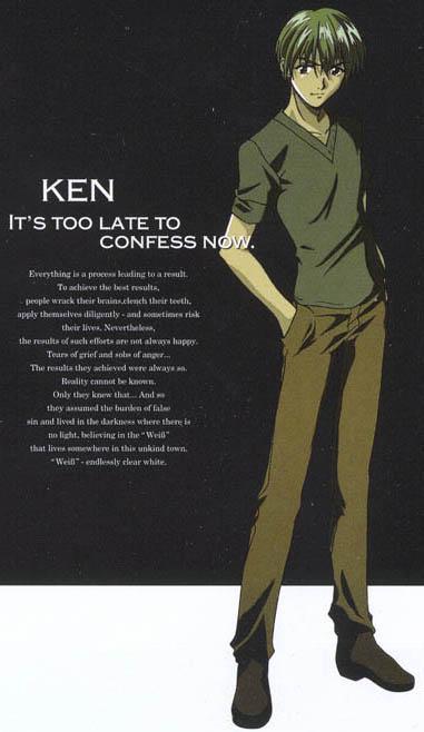 IMAGES: Ken & Youji arguing, Aya: *sweatdrop* manga-y Ken in a biker jacket looking disgruntled Ken & Omi on a magical starry night... Ken looking like an angry street-punk beautiful pic of Ken from the main page Ken lying down, looking seductive...meow. hot Ken posing with his claw. Close-up of Ken's smiling face tell it like it is, brother! odd picture of all the boys posing w/their Image Flowers... erm. purple-tinted posing Ken Strolling through the sewer... sd Ken snoring... kawaii! HOT pic of Ken & Youji in the rain... *purrs* four frantic boys. meow. the boys in tuxedos! SOUND: Gomen nasai.... I have no sound clips for this bishie.... =( BACK HOME rhada@neo-tokyo.org