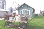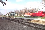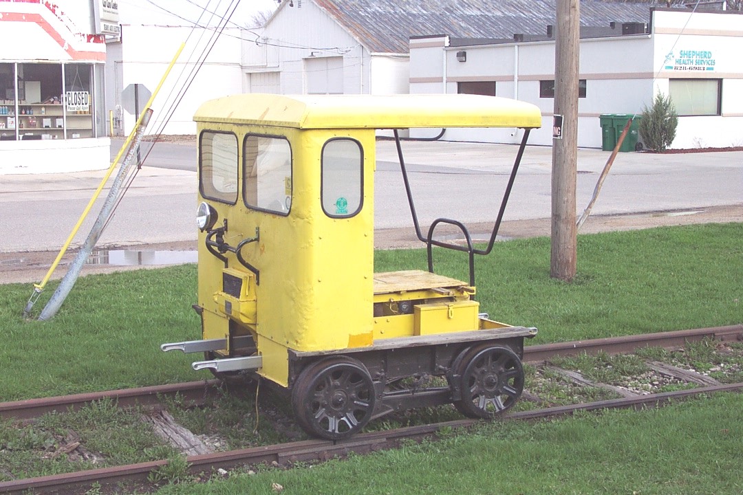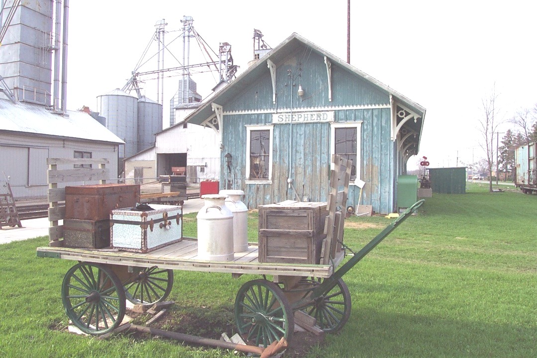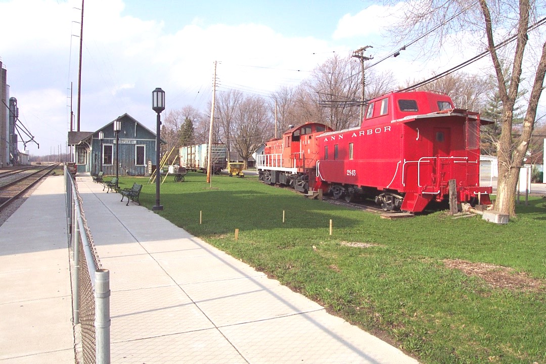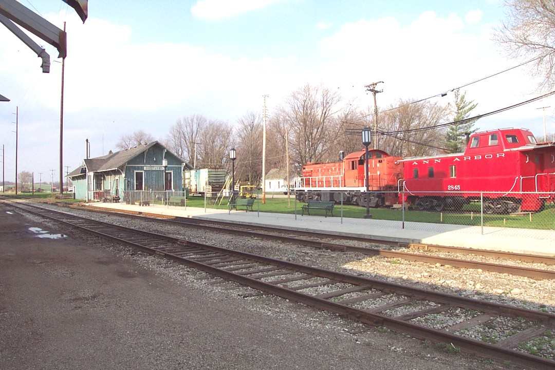 Shepherd, Michigan Railroad Depot Museum and display Ann Arbor ALCo RS-1 20 DT&I boxcar Ann Arbor Caboose 2845 speeder car AA passenger station display in front looking north Back to Eddie's Michigan Railroad Page 1/18/02