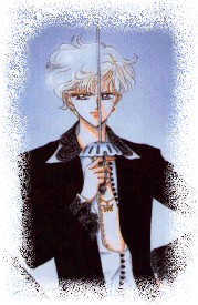 Haruka is the recarnation of the Princess of Uranus, and transforms into the Magnificent Fighter, Sailor Uranus. Haruka is portrayed as the sterotypical "masculine" tomboy. She dresses like a man, and engages in a variety of sports, from motorcross to track and field. Haruka is unquestionably female, but enjoys teasing and flirting with girls. Her inspiration is racing and her passion is to be as fast as the wind. Off the racetrack, she drives a car (without a license), a motorcycle, and a helicopter. She is also a talented pianist and has preformed duets with Michiru. Haruka attends tenth grade at Mugen Gauken Academy and wears the male school uniform (thus it is not surprising that others belive she is a male). In her romantic relationship with Michiru, she holds the dominate role, and is quite possessive. Both Haruka and Sailor Uranus can be extremely blunt, callous and unmerciful when the situation becomes tense. However, after interacting with Sailor Moon, she shows a repressed, softer side. Sailor Uranus is militant about achieving her goals and is willing to sacrafce anyone, including Sailor Neptune, if it is the only option available. |