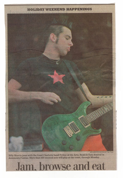 **The Caption reads: "Billy Martin jams with the Good Charlotte band Friday at the Arts, Beats & Eats festival in downtown Pontiac. More than 160 musical acts will play at the event, through Monday"