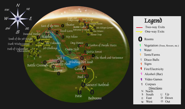 M.O.O. stands for MUD (multi-user-dungeon) Object Oriented. It is a cyber space world created entirely by text descriptions. The assignment was to create a visual map out of the descriptions provided. Every item was thought out, such as each room is represented as a "0" and the objects in each room are designated by a "1" because this is a cyber world and information is created by binary numbers. The idea also applies to various exits because the"||" between "N||S" (in red next to the red paths) on the map is used by some programing languages to say "or". The landmarks (waterfalls, dirt road, etc.) in the MOO were determined by how many exits it contained, so if it had more than one, then it was drawn out. My idea was to make this a fantasy like map. I designed the world as a sphere not only because worlds tend to be a spheres, but also because it represents an idea in one's own mind, sort of like a thought bubble. Programs used: Adobe Photoshop, Bryce 5 |