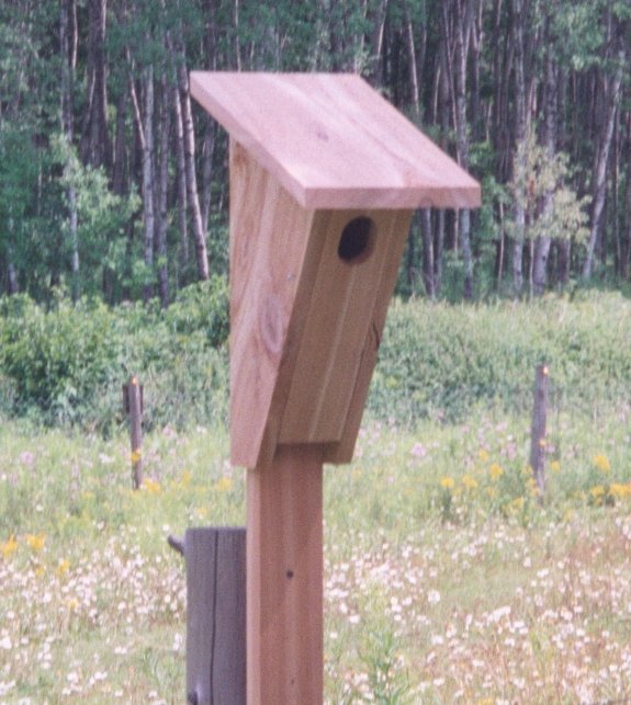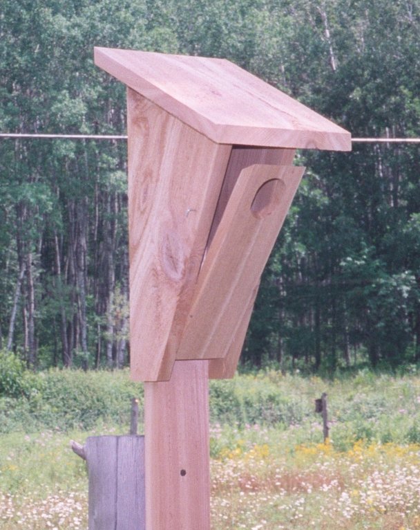 Made of all natural cedar 7/8". In a test conducted in 1996 it was found that bluebirds prefer this style box over the conventional nesting box. The front folds down for easy cleaning and is secured by a L-screw. The back is pre- drilled for easy installation. Other Birds that will use this nesting box: Mountain Bluebird and the Eastern Bluebird (hang 4'-6') Dimensions: 9"W, 11"D, 31"H (Weight 8 lbs.) Opening: 2 ¼" high, 1 3/8" wide oval hole. Availability: Usually shipped 24 hours after receiving order and payment. Item Number: #105 Price: $40.00 Shipping Included!!!!