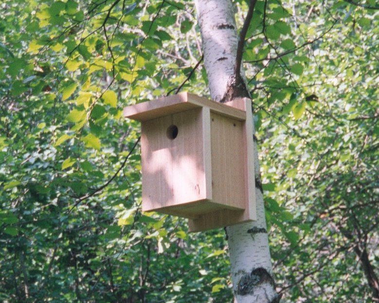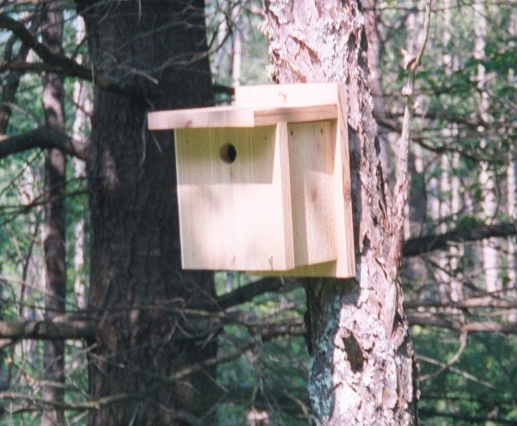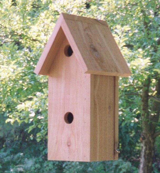 Made of all natural cedar 7/8". The back is pre drilled for easy installation. The side folds out for easy clean out and is secured from the front by a finger tight L-screw. Other Birds that will live in this house: White-breasted Nuthatch (hang 5'-10') Dimensions: 7"W, 9"D, 12"H (Weighs 5 lbs.) Opening: 1 1/4" diameter hole Availability: Usually shipped 24 hours after receiving order and payment. Item Number: #111-B Price: $28.00 Shipping Included!!!!