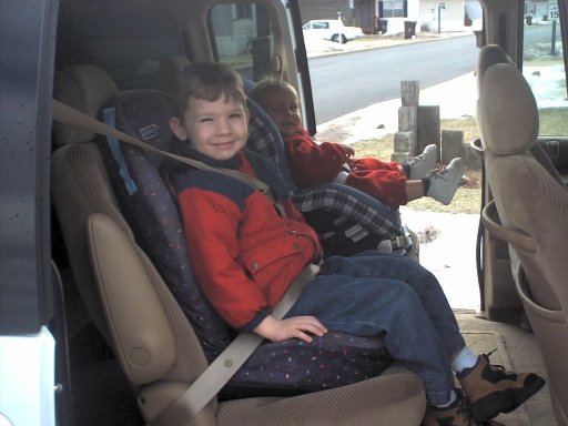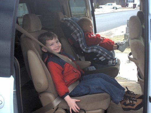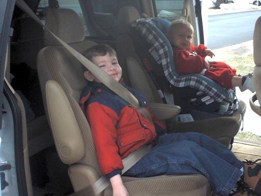 Our van has adjustable shoulderbelts. Here Josh has his in the lowest position. It improves the fit of his shoulder belt, but not QUITE enough - it needs to touch his shoulder. And it doesn't solve the problem of his knees not bending comfortably.