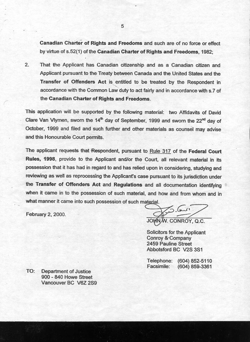 (5) A declaration that the Respondent Minister has failed to comply with s.7 of the CANADIAN CHARTER OF RIGHTS AND FREEDOMS and the common law duty to act fairly in the processing of the Applicant's application for transfer back to Canada by failing to provide him with the "case against" him so as to give him a fair opportunity to respond;