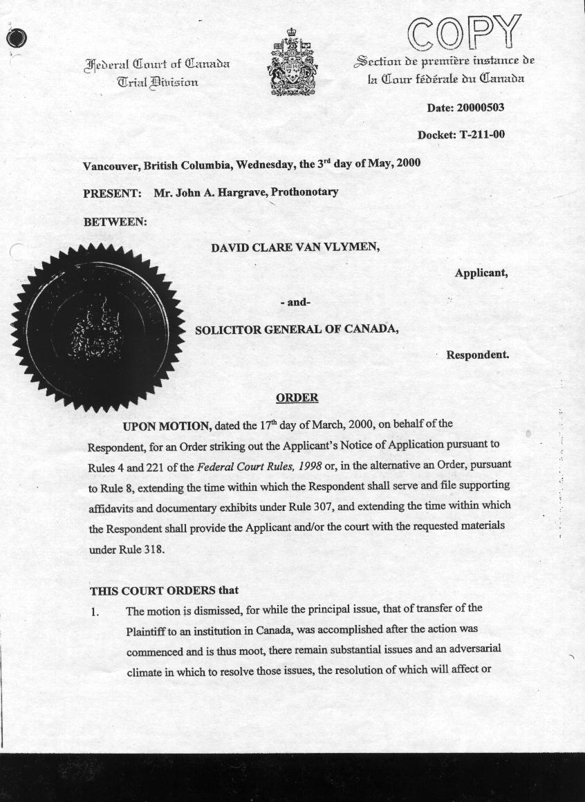 (4) A declaration that the constitutional rights of the Applicant, pursuant to s.6 of the CANADIAN CHARTER OF RIGHTS AND FREEDOMS have been violated by the Respondent Minister since approximately _______________when the United States of America approved his transfer back to Canada and that therefore the Applicant is entitled to an appropriate and just remedy pursuant to s.24(1) of the CHARTER including, an Order for his immediate transfer back to Canada pursuant to the terms of the TRANSFER OF OFFENDERS ACT and the applicable Treaty or Convention between Canada and the United States of America;