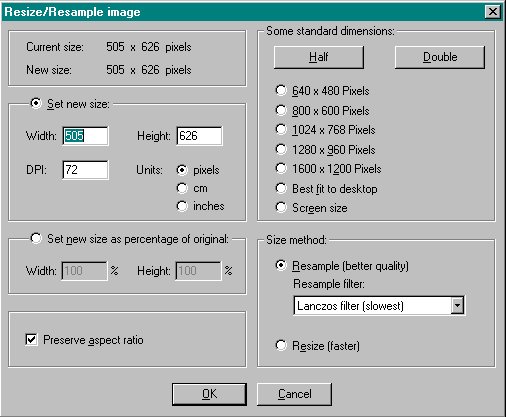 We are now ready to resize the graphic to suit our purposes. *S* Click on the Image link again and this time, select the "Resize/Resample" option. You should get a box similar to this one. Now you have a choice to make about what size you would like the graphic to be. You can type in any number in either the width or height under the "Set New Size" section and it will fill in the number for the other box and automatically resize the graphic to keep it in the aspect ratio. Or you can choose to set the new size as a percentage of the original graphic. For this example, please type in 20 in the "Set new size as percentage of original" and then click the OK button. *S* The new size for the graphic should be 101 x 125 pixels. (For the graphs I've made so far, I usually try to have the height of a graph somewheres around 100-150 pixels.) Now click on the Image link on the tool bar again and select the "Convert to Greyscale" option. Please note that this option along with the "Decreasing Color Depth" is now available for use as it is showing up in the box now and is not grayed out as compared to earlier.